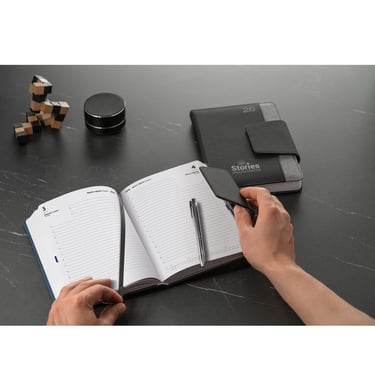 Cadernos com design exclusivo para anotações e divulgação da sua marca.